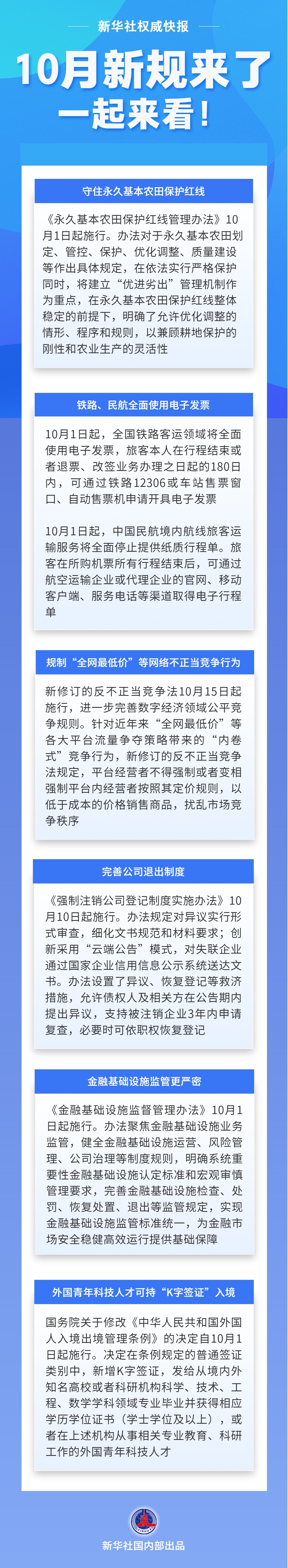 保护永久主要农场保护的红线的新步骤;铁路和民航将从10月1日起充分使用电子发票;在反对和“整个网络中最低价格”和其他不公平竞争行为方面的新修改法律竞赛和法规中的法规……新的十月法规在这里,让我们看看!记者:Qi Qi和Liu Shuo的海报生产:由Qi Qi Xinhua新闻社在国内制造