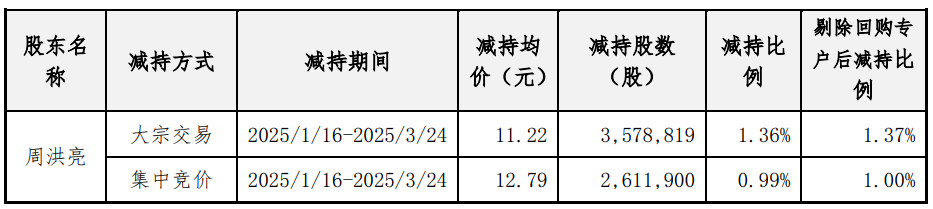 中国经济网北京11月14日电:海能实业(300787.SZ)昨日发布关于持股5%以上股东减持股份的初步披露。持有公司1,892.16万股(占公司总股本6.04%)的股东周洪军因清偿个人债务需要,拟自退出之日起15个交易日后3个月内,通过大宗交易、集中竞价等方式减持公司股份不超过940.29万股。 -ali(即2025年5月5日至2026年3月4日),即不超过公司总股本的3%。其中,通过集中竞价减持不超过313.43万股(占公司总股本的1%),通过大宗交易减持不超过626.86万股(占公司总股本的2%)。以海能实业11月13日收盘价12.39元计算,周洪军的套现金额约为1.17亿元。周洪军系公司控股股东、实际控制人周洪亮的一致行动人。周洪亮和周洪军是兄弟。公司控股股东、实际控制人周洪亮持股49.73%。 2025年3月24日,海能实业披露关于控股股东、实际控制人、董事长减持计划完成的公告。公告显示,公司控股股东、实际控制人、董事长周洪军减持公司股份至6.190719股,释放资金约7356.06万元。海能实业于201年8月15日在深圳证券交易所挂牌上市9、股份总数2122万股,发行价格27.33元/股。保荐机构(主承销商)为中信证券股份有限公司,保荐代表人为刘顺明、孙杨。海能实业首次公开发行募集资金总额为57,994.26万元。本次发行扣除发行费用7,758.02万元后,募集资金净额为50,236.24万元。海能实业2019年8月5日公布的招股说明书显示,公司拟募集资金50236.24万元,将用于江西遂川消费电子一期项目、江西遂川消费电子二期项目、消费电子研发中心升级项目和补充流动资金项目。海能实业首次公开发行股票发行费用总额为7,758.02万元,其中承销及保荐费为5元30亿。海能实业披露的2023年募集资金存放及使用情况专项报告显示,《关于核准安福县海能实业有限公司发行不特定品种可转换公司债券共计600万张,每张面值100元,募集资金总额为6万元》的公告称,上述募集资金总额扣除税务发行费用后,净额本次发行募集资金金额为589,259,392.78元 经计算,海能实业上述两次募集资金总额为117,994.26万元。